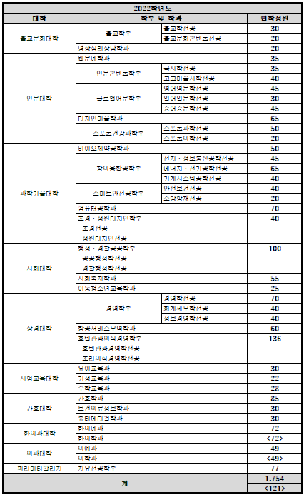 동국대학교 경주캠퍼스 2022학년도 학사과정 모집단위별 입학정원 안내