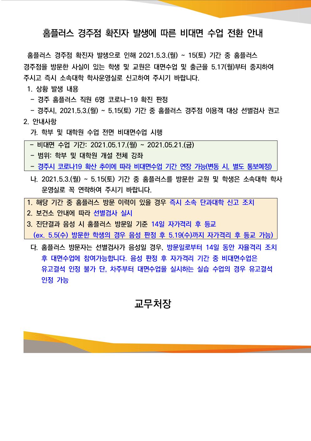홈플러스 경주점 확진자 발생에 따른 비대면 수업 전환 안내