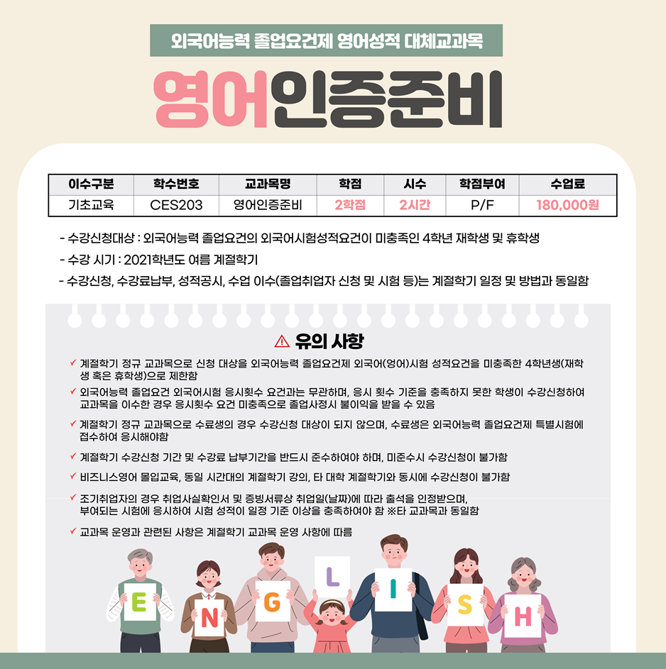 가. 본 “영어인증준비” 교과목은 계절학기 정규 교과목으로 신청 대상을 외국어능력 졸업요건제 외국어(엉어) 시험 성적요건을 미충족한 4학년생(재학생 혹은 휴학생)으로 제한함, 본 “영어인증준비” 교과목은 외국어능력 졸업요건 외국어시험 응시횟수 요건과는 무관하며, 응시 횟수 기준을 충족하지 못한 학생이 수강신청하여 교과목을 이수한 경우 응시횟수 요건 미충족으로 졸업사정시 불이익을 받을 수 있음