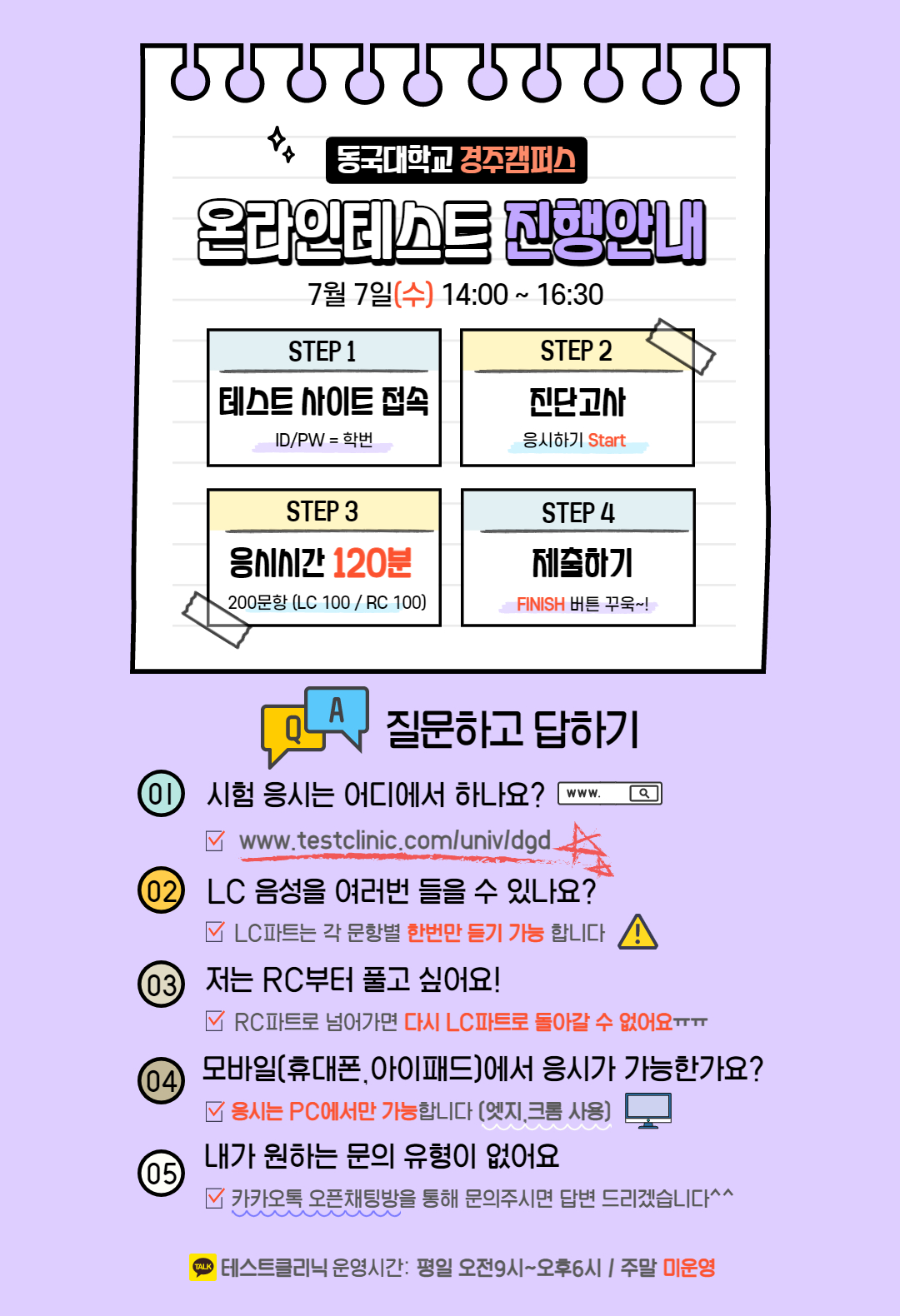 ※시험 당일 오후 1시 50분부터 로그인이 가능합니다. 시험시간은 오후2시부터 오후 4시 30분까지이며, 오후 4시 30분 이후에 완료되는 경우 혹은 시험 시간이 1시간 이하인 경우에는 시험 성적 및 시험 횟수로 인정하지 않습니다. 재학생들의 외국어 능력 향상과 공인인증시험 성적 향상을 위한 무료 모의토익에 학생들의 성실한 시험응시를 바랍니다. .