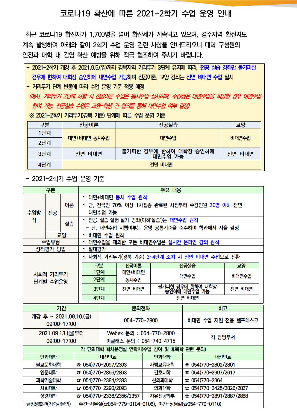 코로나19 확산에 따른 2021-2학기 수업 운영 안내