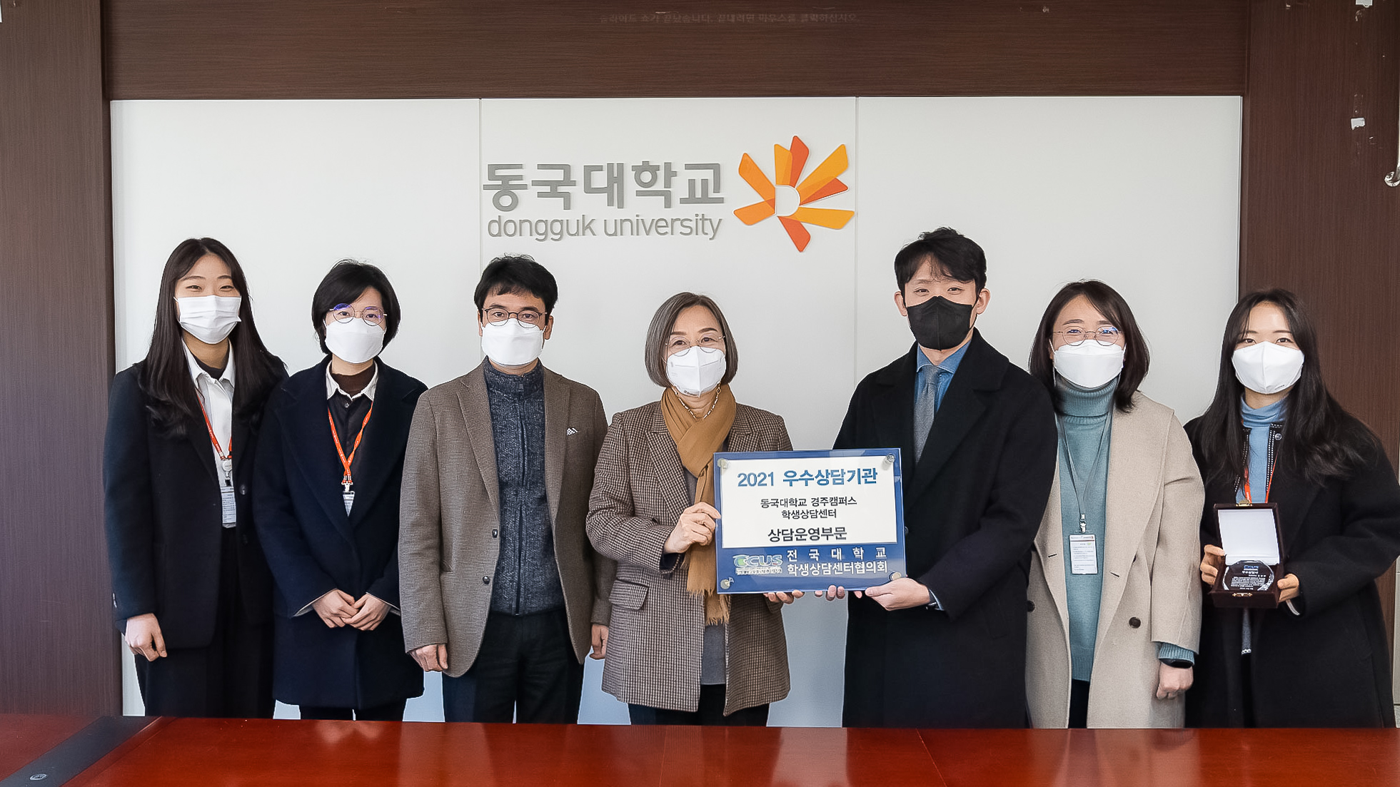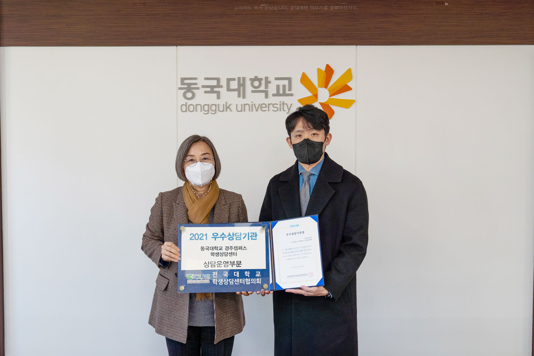 동국대학교 경주캠퍼스 학생상담센터는 2021년 우수상담기관(운영부문)과 우수상담원(정원우 상담원) 등 2개 부문을 수상했다.