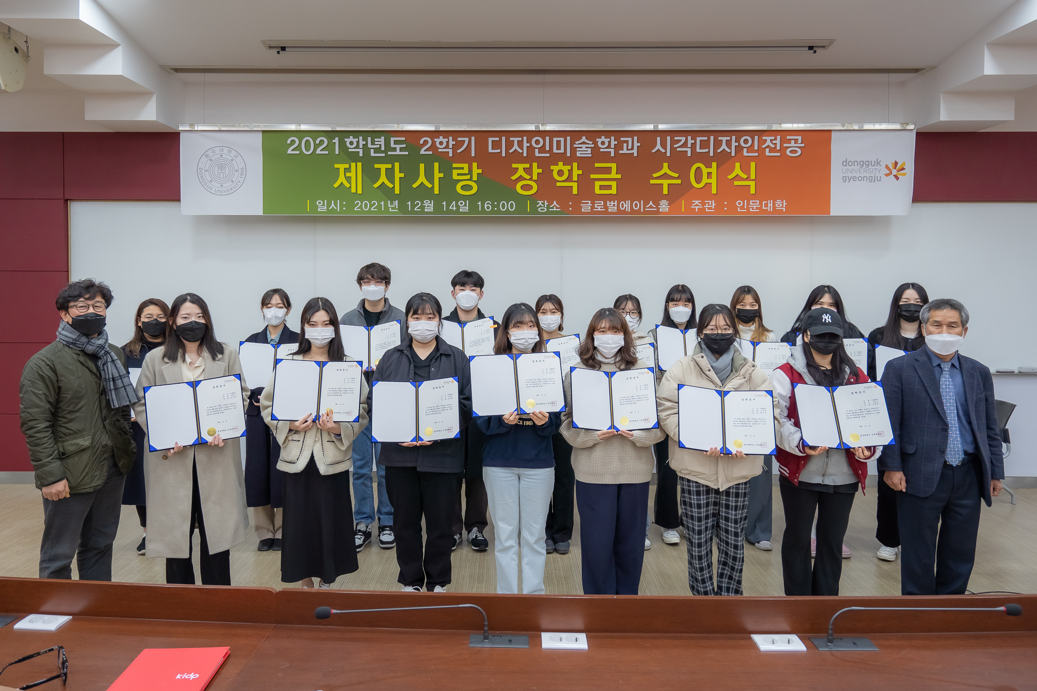 동국대학교 경주캠퍼스는 지난 14일 교내 원효관 글로벌에이스홀에서 디자인미술학과 시각디자인전공 제자사랑 장학금 수여식을 개최했다.