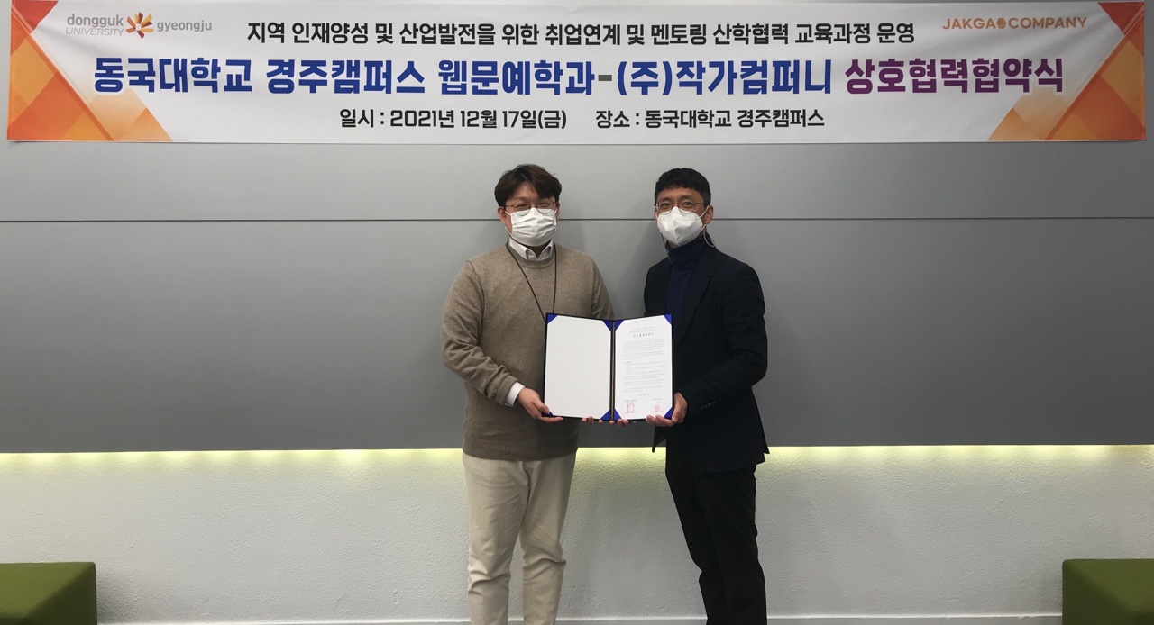 동국대학교 경주캠퍼스 웹문예학과와 ㈜작가컴퍼니가 지난 17일 교내 원효관에서 ‘지역 인재양성 및 산업발전을 위한 취업연계 및 멘토링 산학협력 교육과정 운영’을 위한 상호 협력 협약(MOU)을 체결했다.