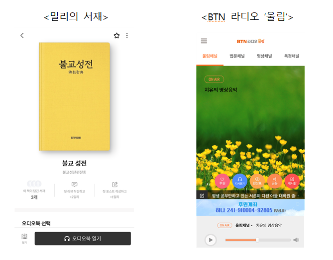 △ ‘밀리의 서재’는 언제 어디서든 쉽고 빠르게, 스마트폰과 PC를 통해 나만의 독서를 즐길 수 있는 전자책 서비스 어플로, 스마트폰 등에 어플을 설치하고 가입과 함께(1개월 무료 구독) 다양한 책을 즐길 수 있다는 점에서 최근 인기를 모으고 있다. 동국대학교 출판문화원은 〈불교성전〉 오디오북 제작을 위해 지난 6월 ‘불교성전 오디오북 제작 고불식’을 봉행하고, KBS 디지털제작부 성우 6명과 함께 〈불교성전〉을 녹음했다. 〈불교성전〉 오디오북은 ‘밀리의 서재’ 어플에서 검색창에 ‘불교성전’을 검색하면 이용 가능하다.