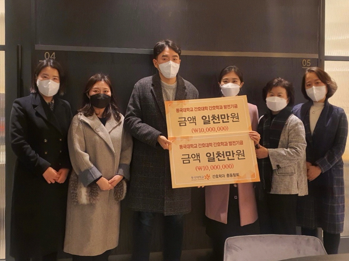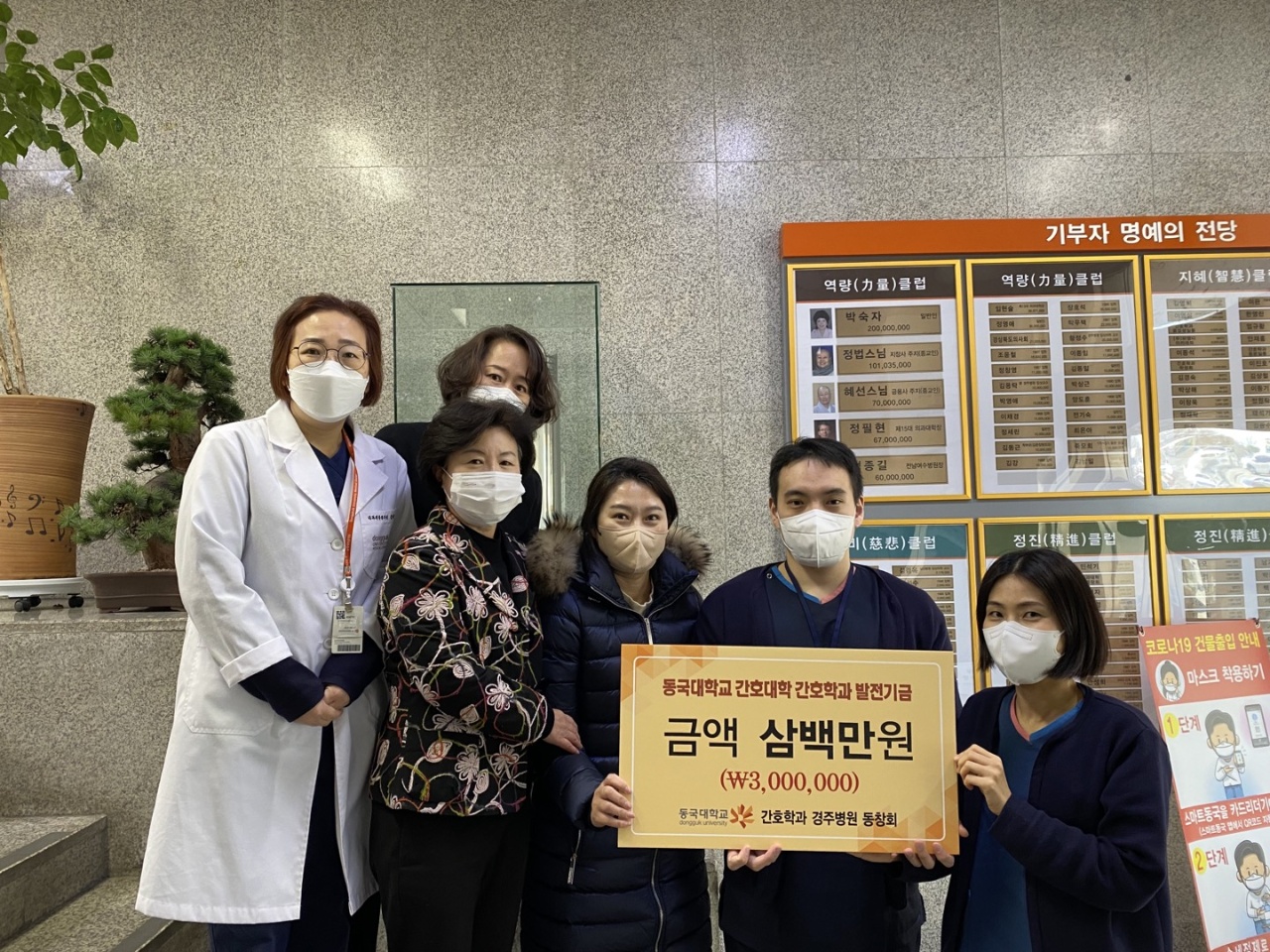 지난 22일에는 김강산 간호학과 동문을 비롯한 동국대 경주병원 동문회가 ‘간호대학 간호학과 발전기금’으로 300만 원을 전달했다.