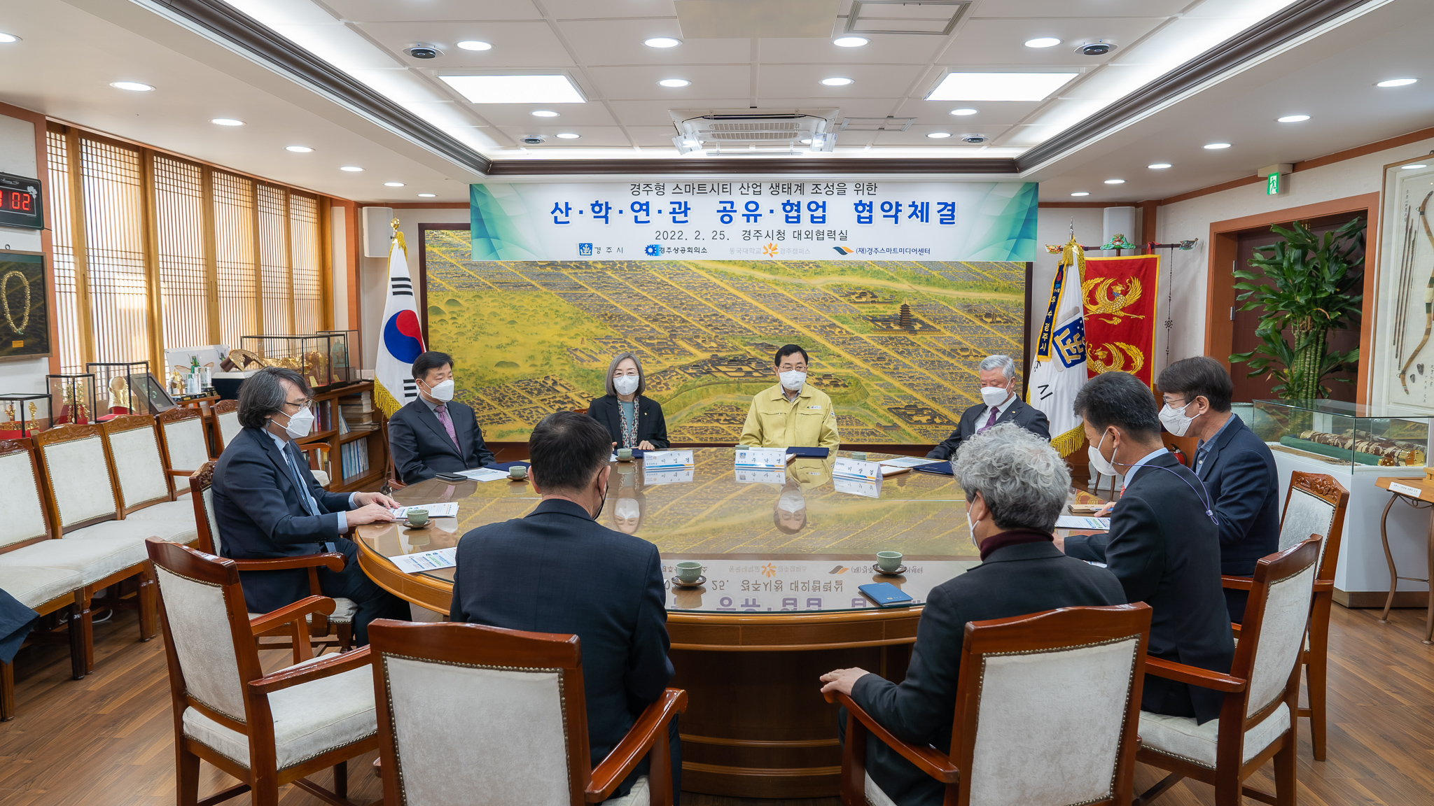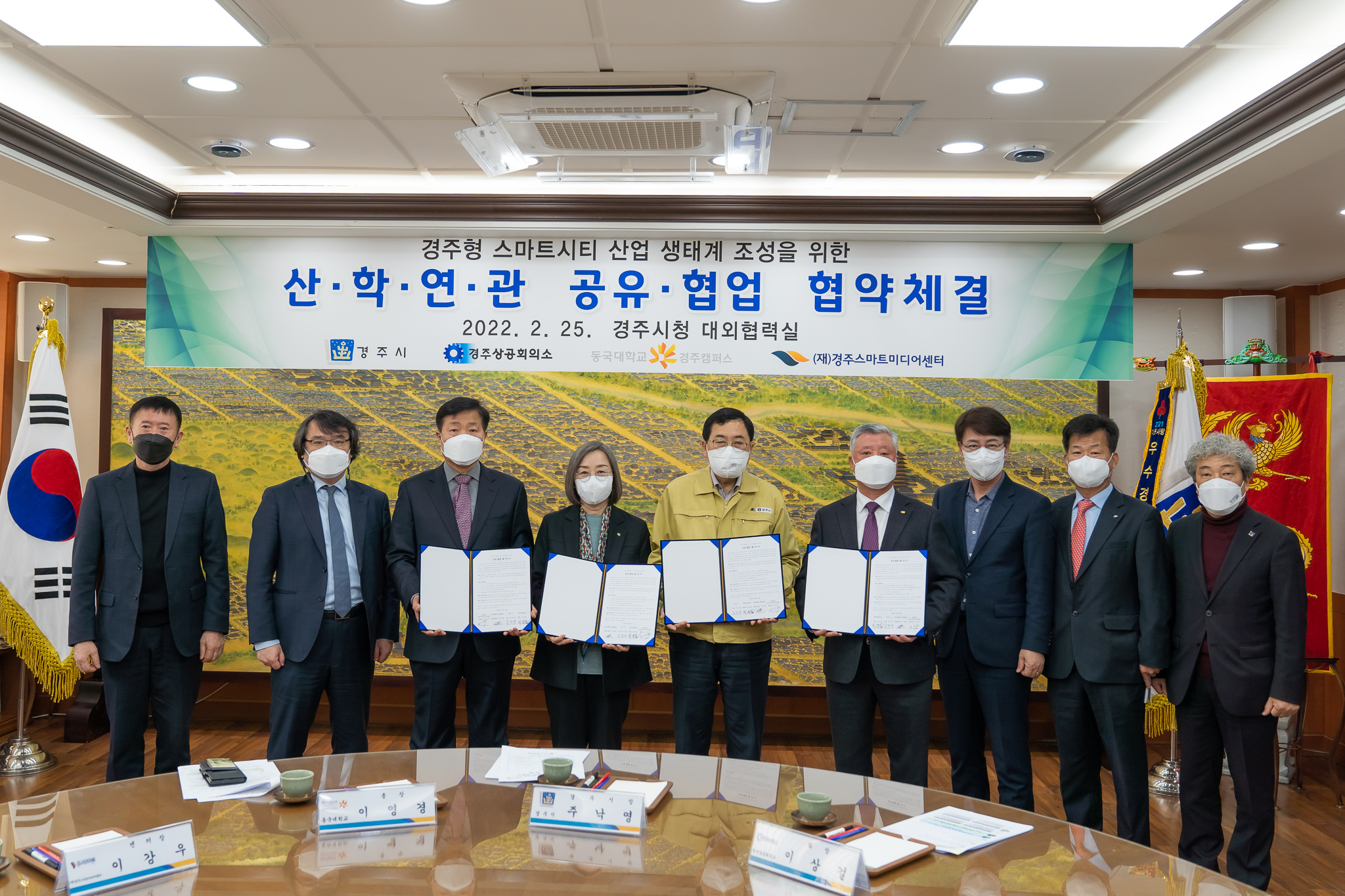 동국대학교 경주캠퍼스가 지난 25일 오전 10시 경주시청 대외협력실에서 경주시, 경주상공회의소, 경주스마트미디어센터와 경주형 스마트도시 미래 산업혁신 및 신산업 융합인재 양성을 위한 산학연관 공유ㆍ협업 협약을 체결했다.