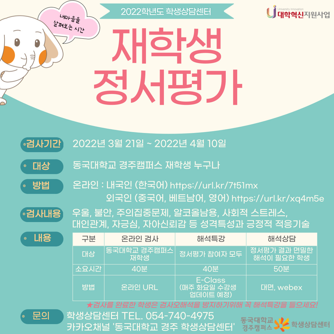 재학생 정서평가에 대한 보다 자세한 내용은 동국대학교 경주캠퍼스 홈페이지 공지사항을 통해 확인이 가능하며, 관련 문의는 학생상담센터(054-740-4975, 카카오톡 플러스친구 : 동국대학교 경주 학생상담센터)를 통해 안내를 받을 수 있다.