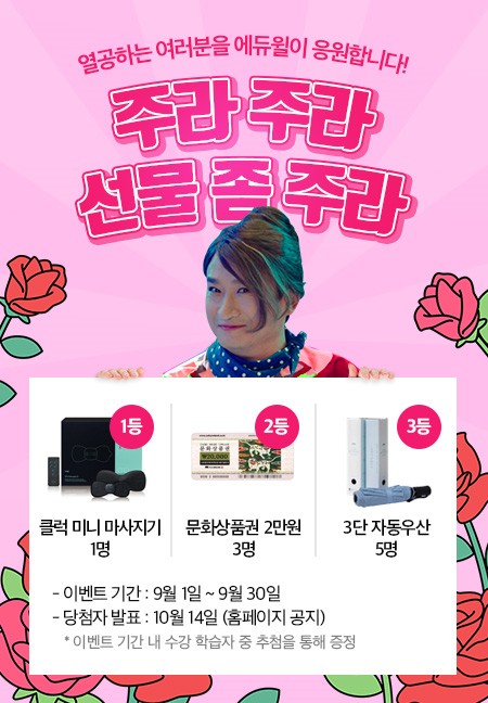 2학기 개강을 맞아 9월 수강생을 대상으로 아래와 같이 이벤트를 시행하오니 학생들의 많은 참여 바랍니다.