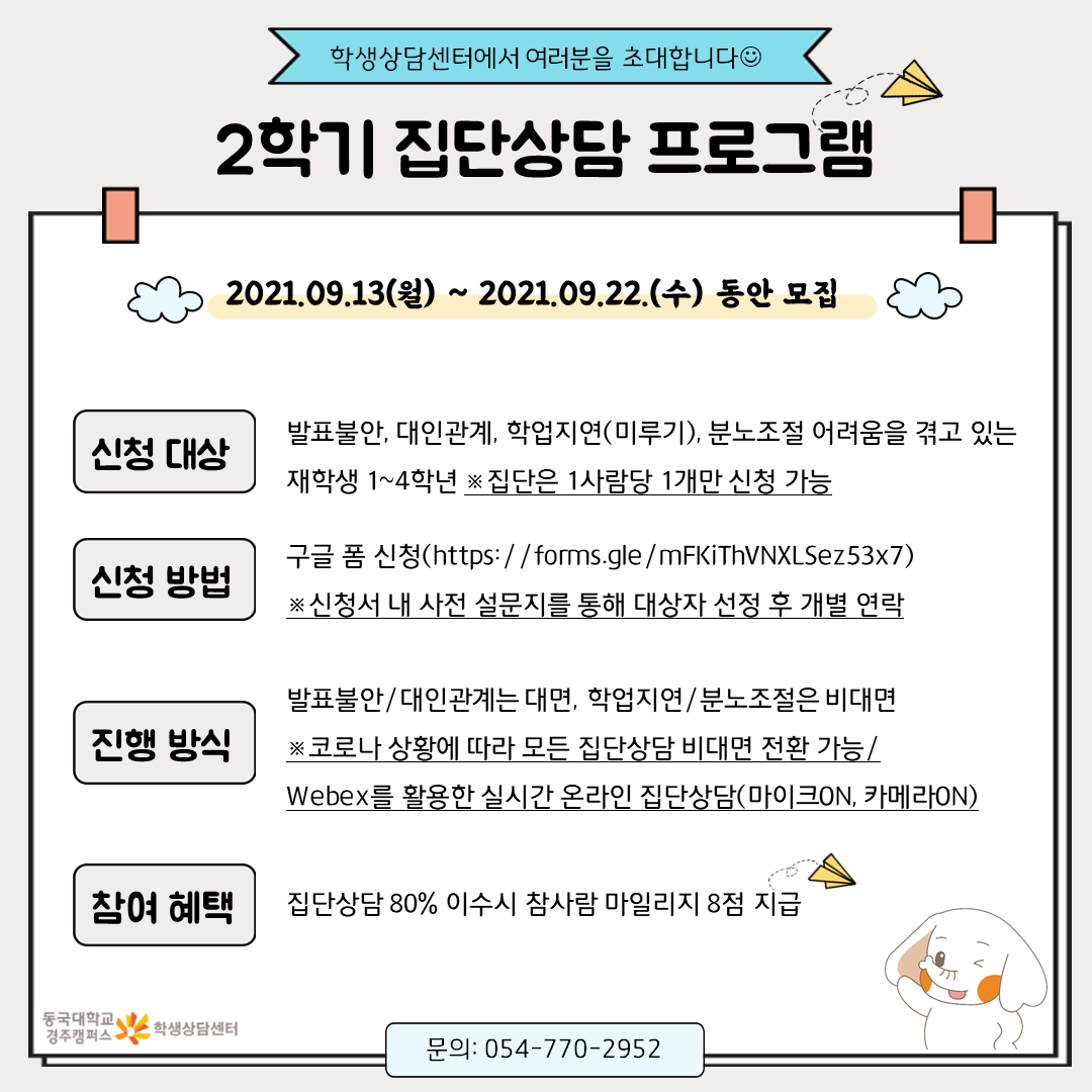 * 2021-2학기 집단상담 참여 신청서: https://forms.gle/mFKiThVNXLSez53x7