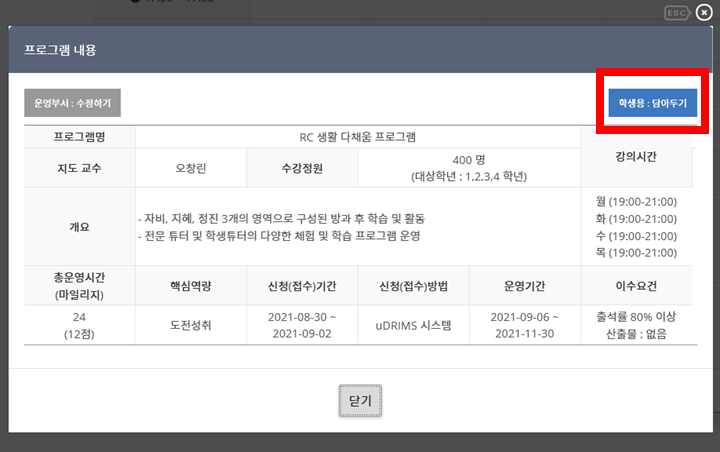 (비교과 프로그램 운영일정 메인 화면 상단 오른쪽 "담아둔 프로그램 확인하기")