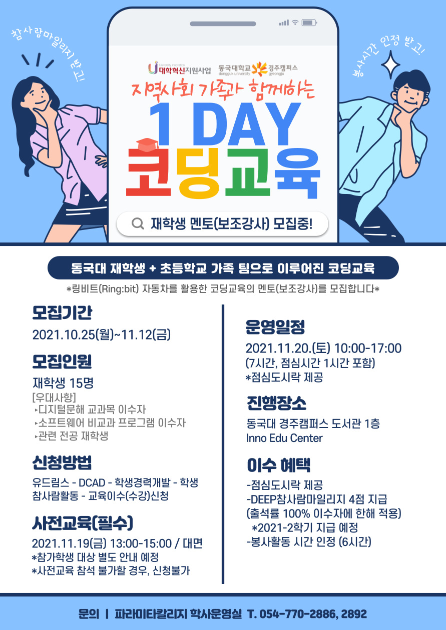 파라미타칼리지에서는 정보문해 수업에서 배운 지식 또는 관련 전공에서 배운 지식을 활용하여 지역사회에 봉사할 수 있는 프로그램인 "지역사회 가족과 함께하는 1 Day 코딩 교육 프로그램"을 운영합니다. 본 프로그램에서 멘토(보조강사)로 참여할 재학생을 모집하오니 학생 여러분의 많은 관심과 참여 바랍니다.