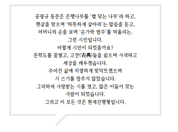 공광규 동문은 은행나무를 ‘별 닦는 나무’라 하고, 햇살을 맞으며 ‘따뜻하게 살아라’는 말씀을 듣고, 어머니의 손을 보며 ‘손가락 염주’를 떠올리는, 그런 시인입니다.