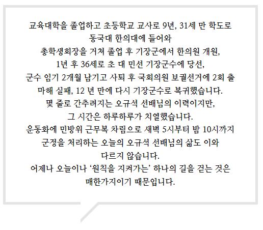 대학 생활에서도 그러했지만 교사로, 한의사로, 또 정치인으로서 저는 어느 자리에 서든 원칙을 지켜가고자 힘썼습니다.