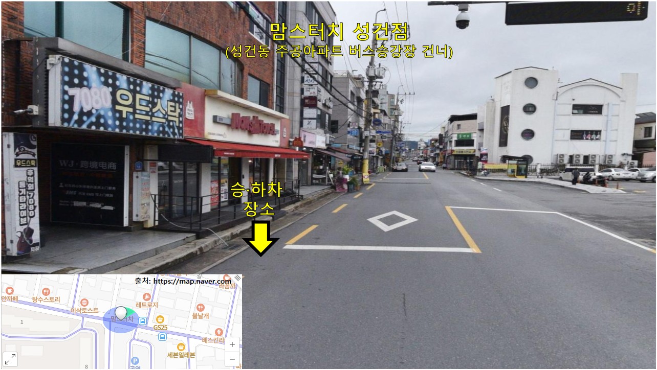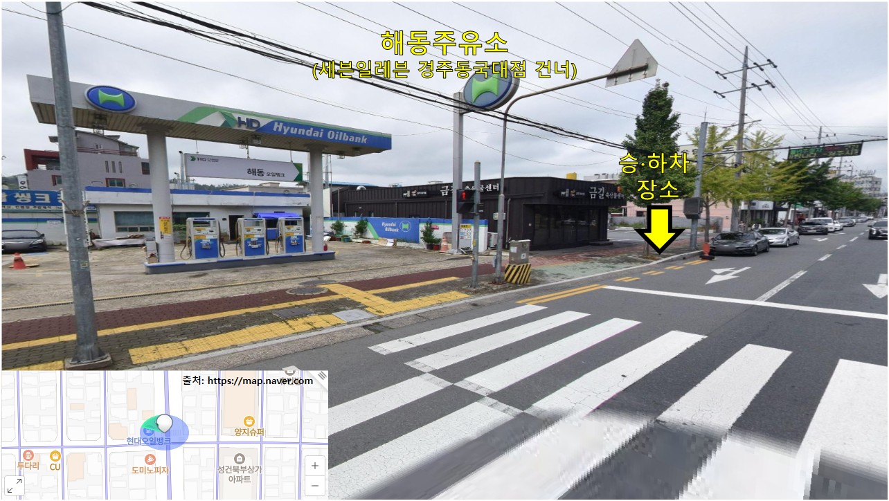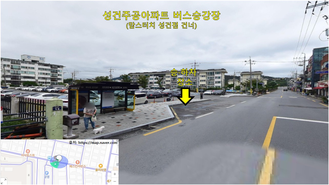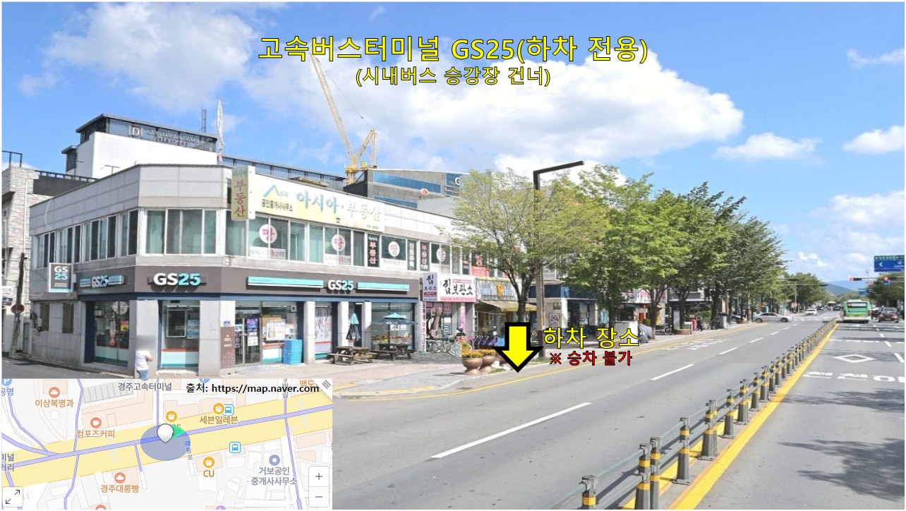 고속버스터미널 GS25 앞 경유지는 시내버스 승‧하차 전용구역으로 도로 교통 사정상 승차가 불가함. (하차 전용)